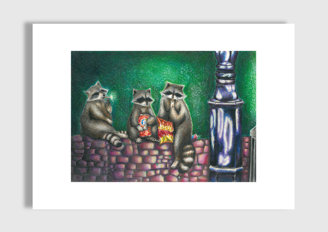 Inspired by the lasting art of tattooing, Williams’ coloured pencil work primarily features realistic designs infused with fantastical elements. Their artistic style embraces the whimsical and surprising, such as a raccoon with a cigarette or a rabbit with moth wings. These imaginative combinations are created with the aim of eliciting a smile.